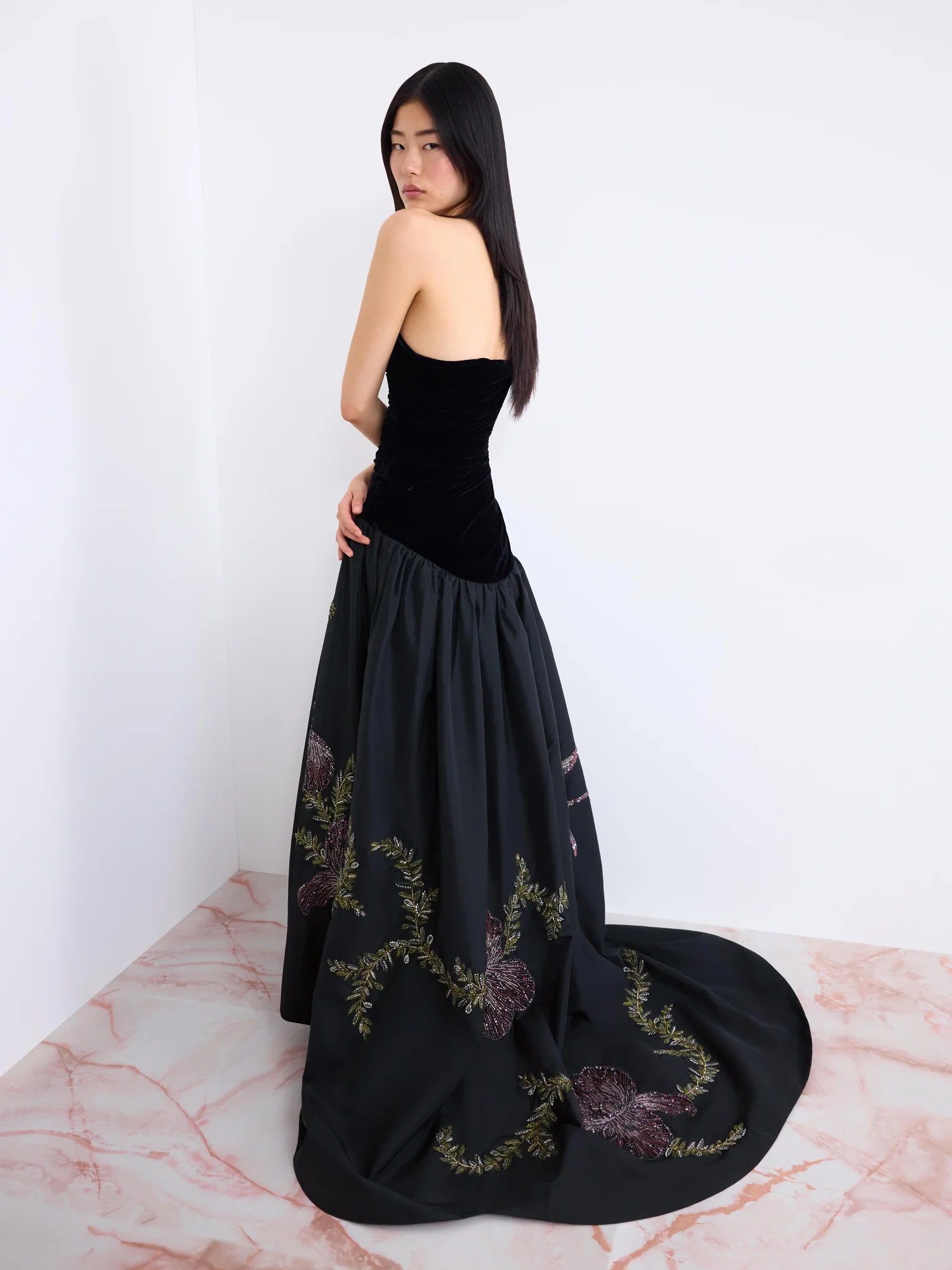 A true statement piece, the Eden Dress evokes the timeless elegance of Clio Peppiatt muse Audrey Hepburn. The drop-waist velvet bodice is delicately draped and expertly structured with internal boning, secured by an internal waistband to create a refined, sculptural form. It falls into a voluminous taffeta skirt, brought to life with exquisite hand embroidery: twisting irises and olive vines unfurl across the fabric, while a shimmering crystal swallow traces the skirt in a subtle, iridescent flourish.