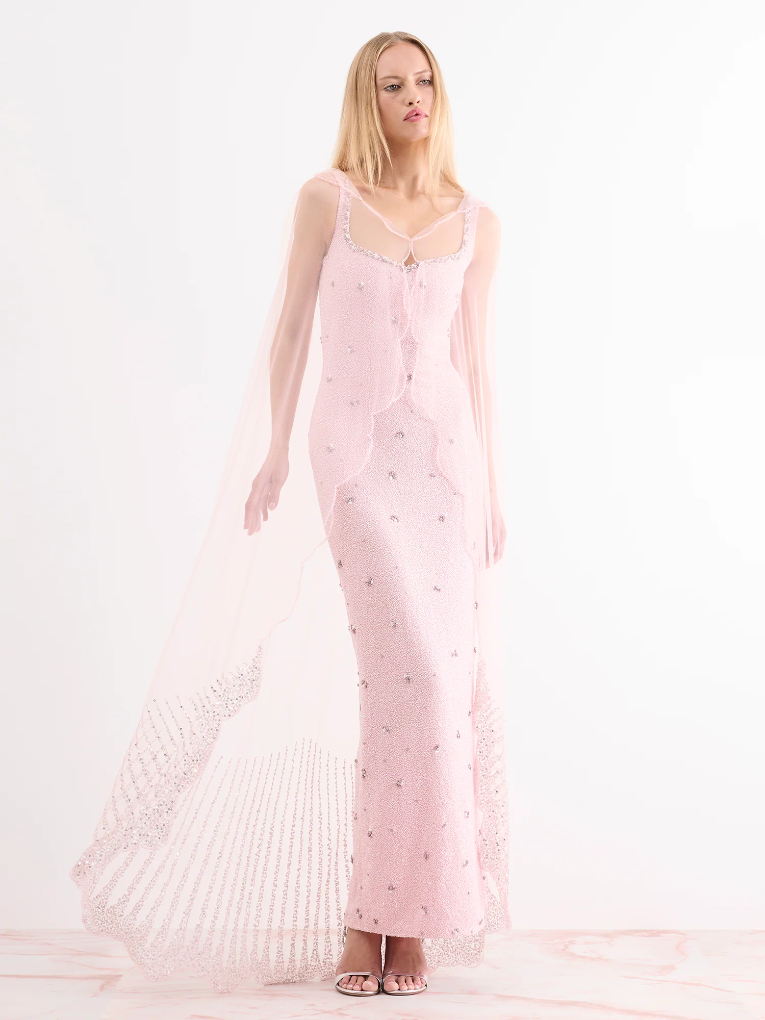 The Moonray Cape in embroidered tulle captures the magic of moonbeams glittering through a midnight sky. The dramatic floor-length cape features a delicately scalloped detail and intricate embroidery which shimmers upwards from the hem. The cape pairs perfectly with the Sophia and Selene dress in matching rose hues.