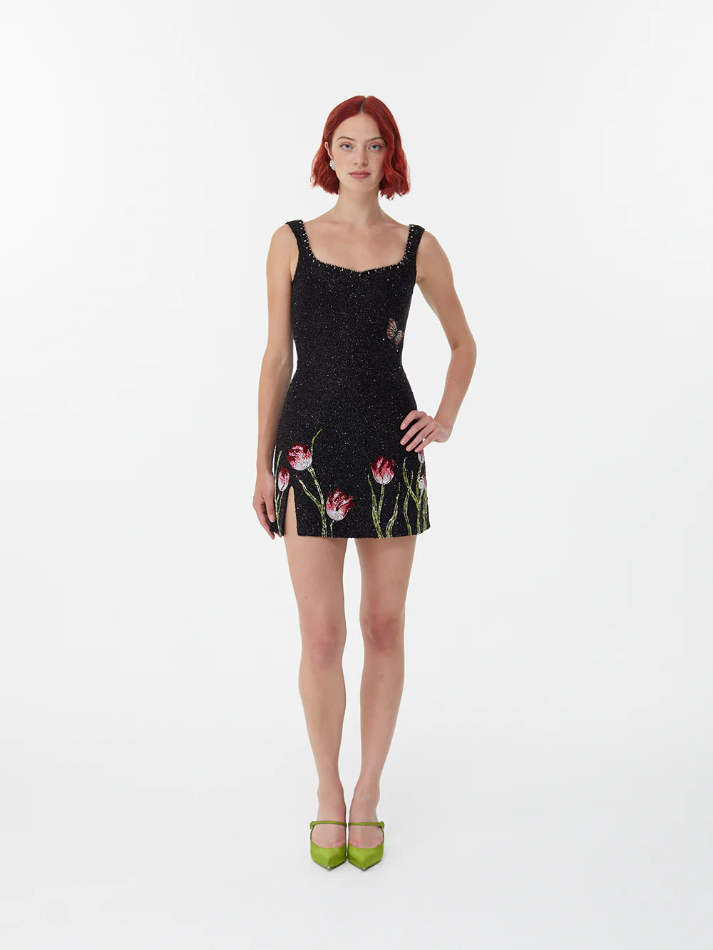 Hand beaded by our artisanal makers, the Tulip dress features a dazzling array of garden motifs on a glittering black beaded base. It is the perfect cocktail-hour mini dress for your summer soirée. Pair with our new pearlescent Petal Bag for the complete Clio Peppiatt look.